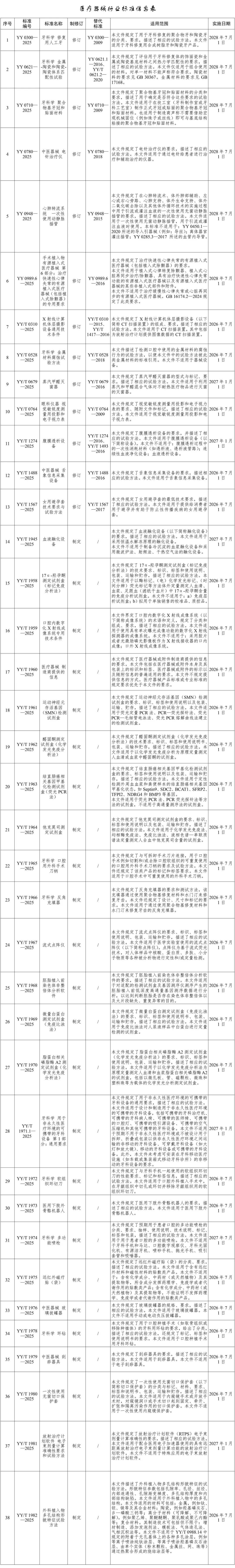 近日,国家药监局发布了YY 0300—2025《牙科学 修复用人工牙》等38项医疗器械行业标准的公告,相关标准编号、名称、适用范围和实施日期等信息公告如下: