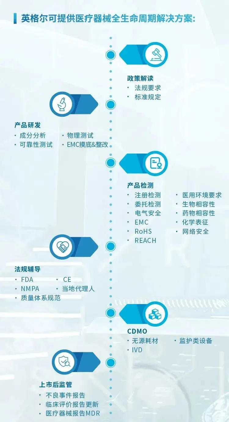 英格尔旨在帮助客户缩短注册周期,攻克审核材料难点、提升市场竞争力,同时使得客户获得高质高效、快速响应的服务体验。目前,公司已建成了认证咨询平台与检测平台, 具体服务领域包括:医疗器械欧盟CE认证咨询(MDR、IVDR)、临床评价、医疗器械体系认证咨询、美国FDA注册咨询(包括510K、QSR 820等)、产品检测及咨询服务(电磁兼容、电气安全、性能、生物相容性、化学表征,无线、包装测试等);国内注册NMPA咨询服务(产品注册证咨询服务、生产许可证咨询服务、经营许可证咨询服务)。